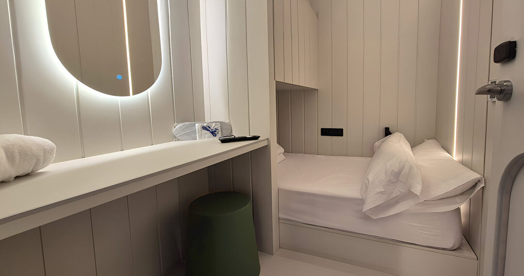¿Eres de los que prefieren tener los pies en la tierra? Esta cápsula está pensada para ti. Diseñada para jóvenes viajeros como tú, combina estilo urbano, funcionalidad y ese efecto flow que hace la diferencia. Descansa, trabaja, estudia o disfruta de tu serie favorita en total privacidad, gracias a su excelente aislamiento acústico que garantiza tranquilidad sin interrupciones. Todo esto acompañado de una cama de 1,00 x 2,00 m, elegida especialmente para ofrecerte el mejor descanso tras un día lleno de descubrimientos.